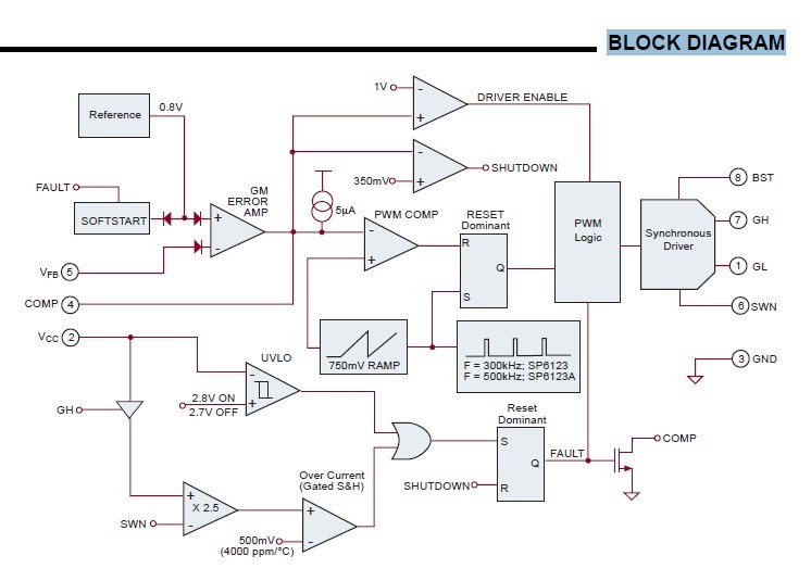 The SP6123CN is a fixed frequency, voltage mode, synchronous PWM controller designed to work from a single 5V or 3.3V input supply, providing excellent AC and DC regulation for high efficiency power conversion. Requiring only few external components, the SSP6123CN packaged in an 8-pin NSOIC, is especially suited for low voltage applications where cost, small size and high efficiency are critical. The operating frequency is internally set to 300kHz (SP6123CN)allowing small inductor values and minimizing PC board space. The SP6123CN drives an all N-channel synchronous power MOSFET stage for improved efficiency and includes an accurate 0.8V reference for low output voltage applications.